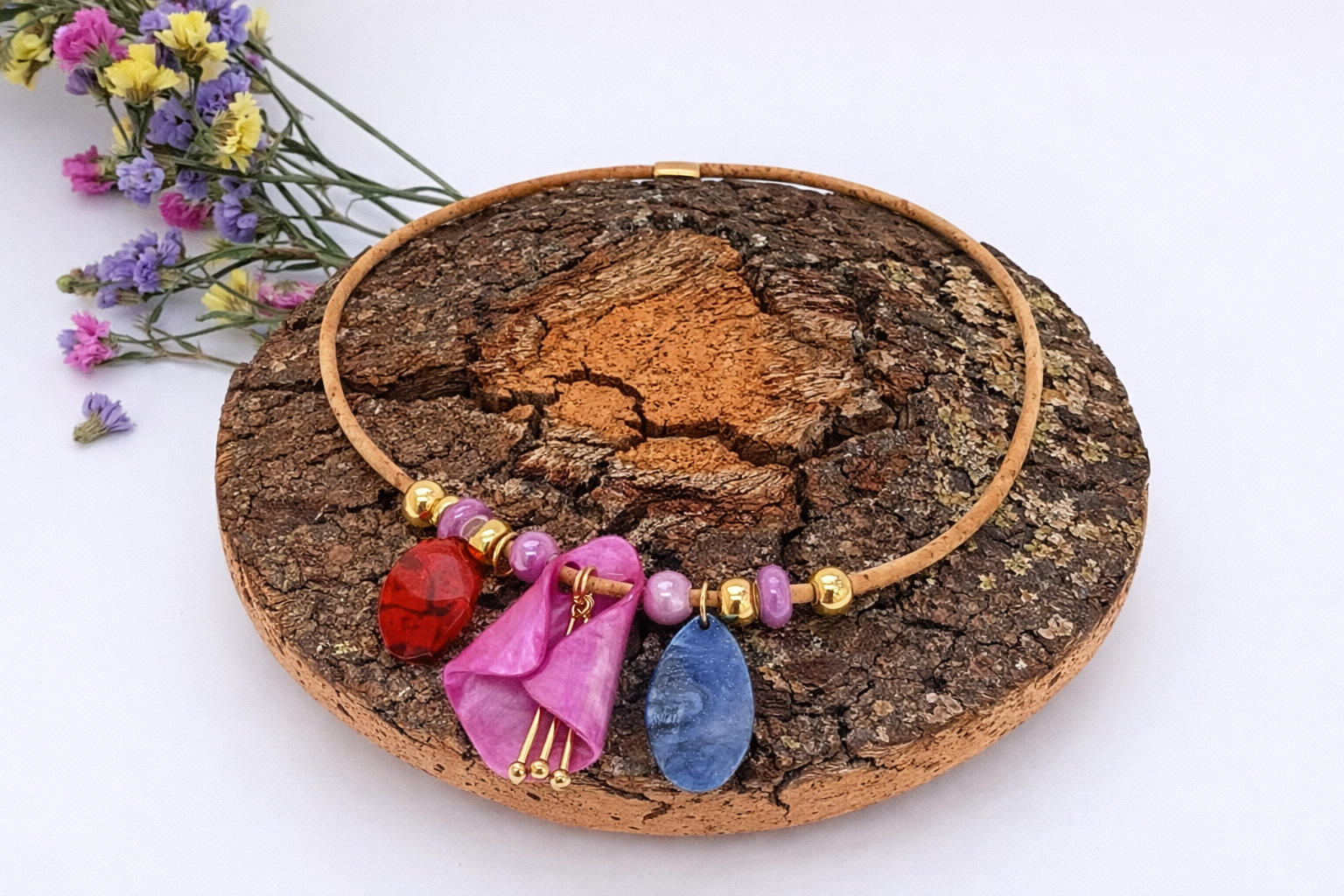 Colar artesanal feito à mão em cortiça portuguesa natural, com resinas coloridas que trazem um toque vibrante e moderno. Os pendentes dourados acrescentam elegância e sofisticação, criando um contraste harmonioso com a textura orgânica da cortiça.