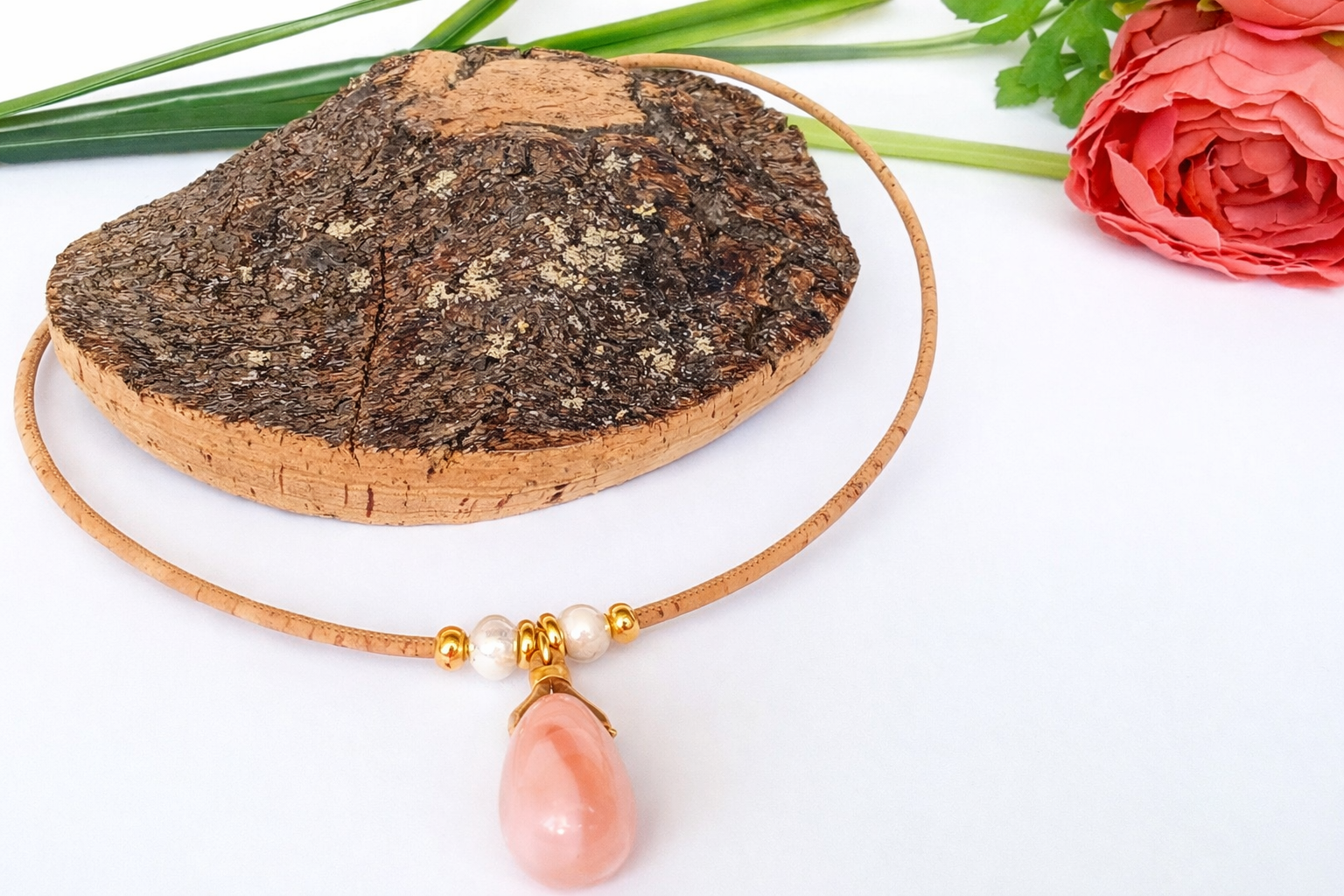 Elegante colar artesanal em cortiça natural portuguesa, combinando pedra rosa e cerâmicas em tom bege. Detalhes em contas douradas acrescentam sofisticação. Peça única, feita à mão, que une tradição e estilo contemporâneo.