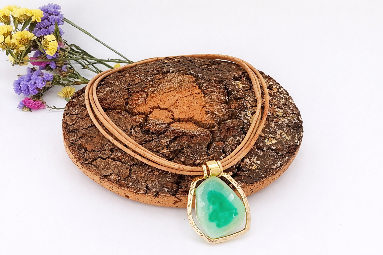 Este colar artesanal destaca-se pelo seu design de três voltas em cortiça natural portuguesa, com um elegante pendente em acrílico verde-claro e toques metálicos dourados, incluindo o fecho. Uma peça com personalidade, que une materiais naturais e acabamentos sofisticados.