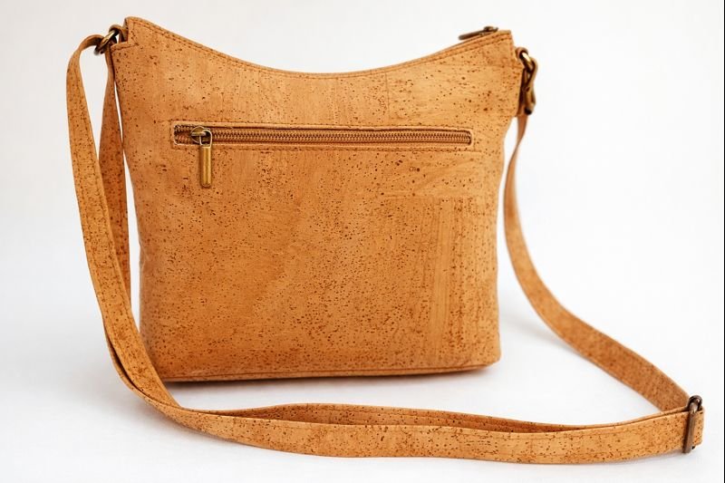 Mala elegante fabricada em cortiça natural, destacando-se pelas faixas decorativas em cortiça estampada com delicadas flores em tons de rosa e verde, que acrescentam um toque feminino e distinto ao design.