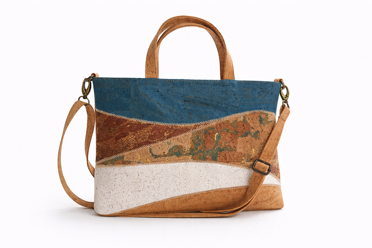 Esta mala é confeccionada em cortiça natural, com um design em camadas que combina tons de cortiça natural e cortiça branca, criando um visual moderno e elegante.