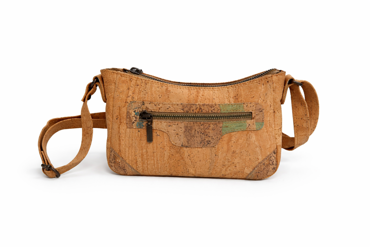 Bolsa tiracolo em cortiça natural, elegante e sustentável, com detalhes em cortiça mesclada que lhe conferem um toque moderno e distintivo. Leve e resistente, é ideal para o dia a dia, combinando funcionalidade com design sofisticado.