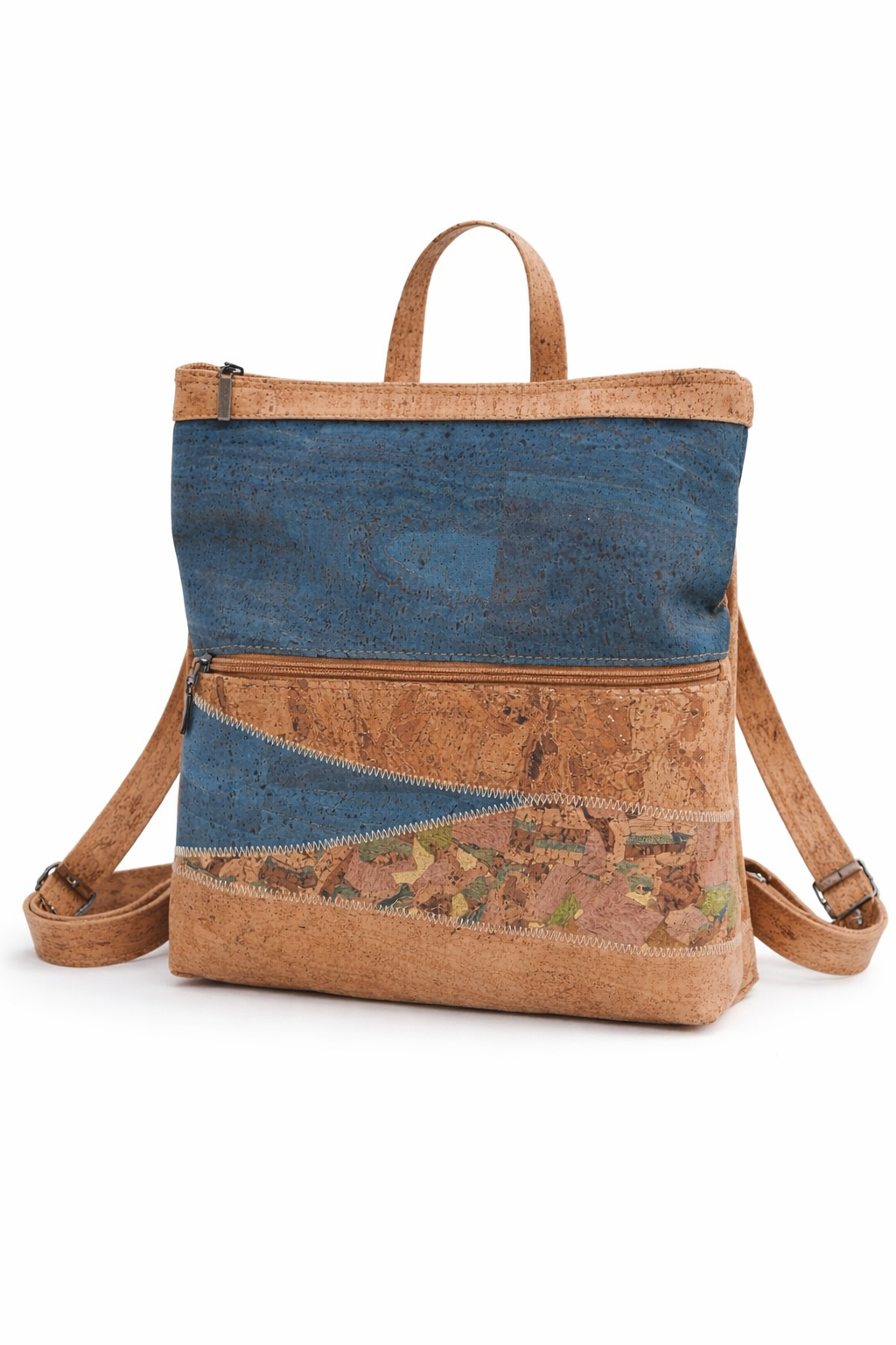 Mochila confeccionada em cortiça natural de alta qualidade, com elegantes recortes frontais em cortiça colorida que adicionam um toque moderno e sofisticado ao design. Possui bolso frontal funcional para fácil acesso aos seus itens essenciais e ferragens em ouro velho, que garantem um acabamento clássico e refinado.