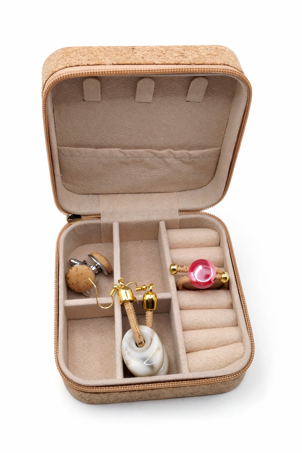 Porta-Joias em Cortiça Natural com Padrão Floral, elegante e sustentável. O interior forrado a veludo macio protege as suas joias contra riscos e mantém tudo organizado com segurança.