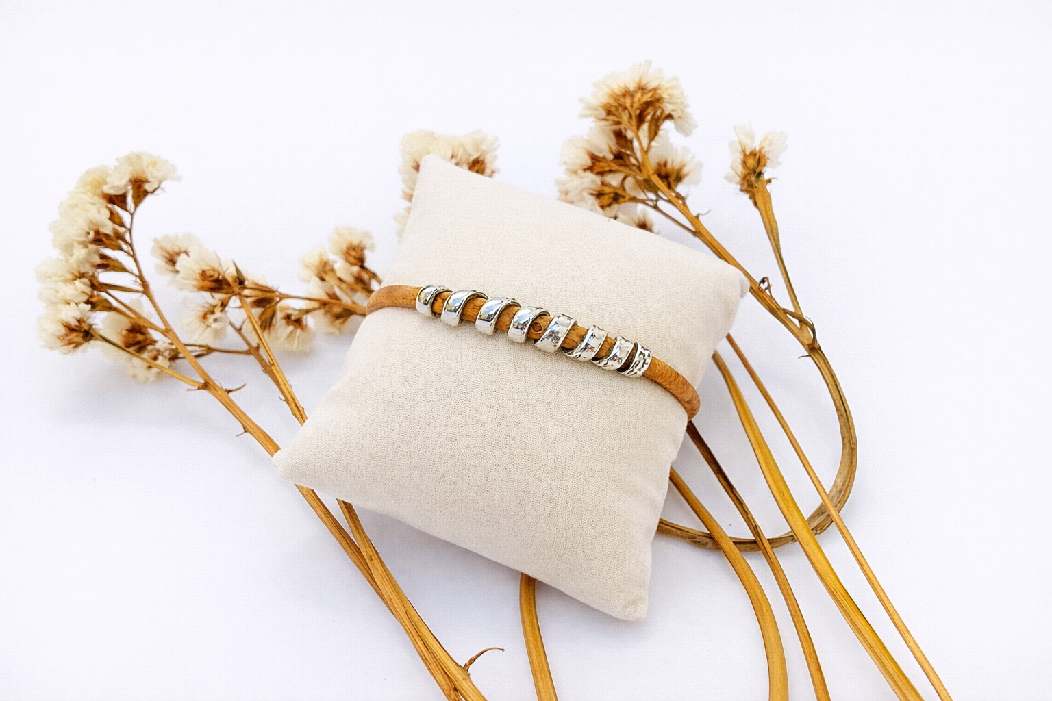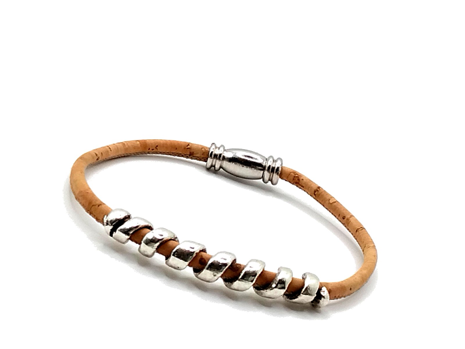 Pulseira feita à mão em cortiça portuguesa natural, material leve, flexível e ecológico. O design é realçado por uma elegante espiral em prata, que acrescenta brilho e sofisticação. O fecho magnético garante praticidade e segurança no uso diário.