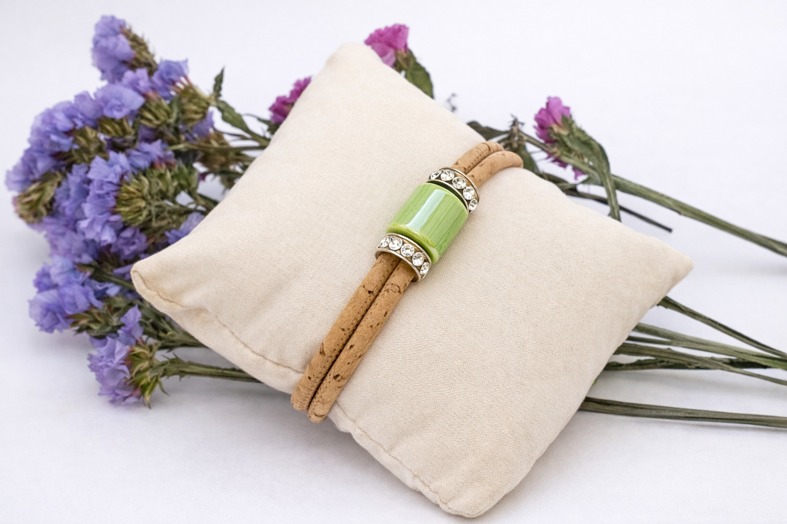 Feita à mão em Portugal, esta pulseira destaca-se pela fusão entre o design artesanal e a sustentabilidade. Produzida em 100% cortiça portuguesa natural, é leve, resistente e ecológica.
