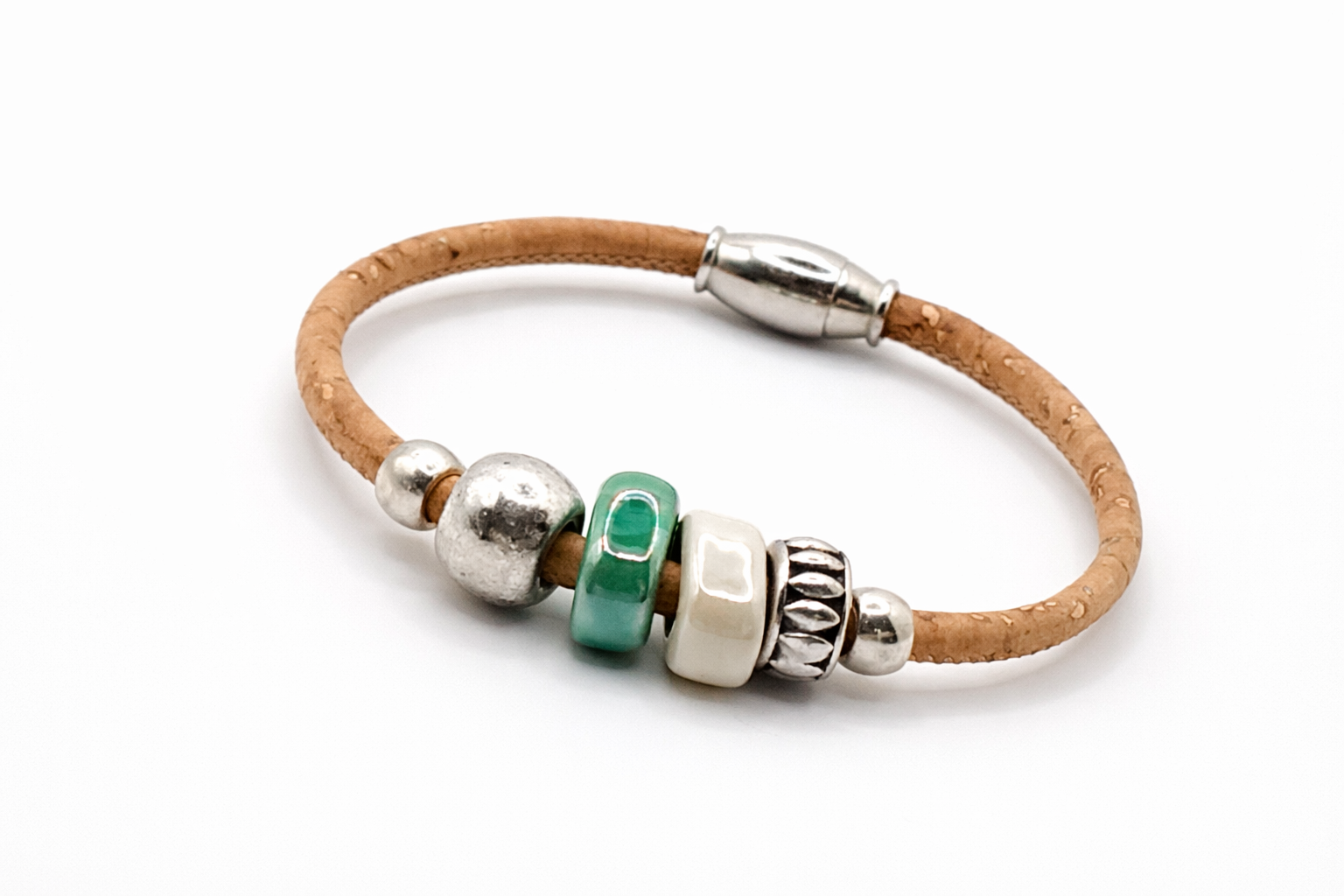 Esta pulseira artesanal é confeccionada em cortiça natural, leve e sustentável. As contas prateadas acrescentam um brilho delicado, enquanto os detalhes em cerâmica branca e verde trazem frescura e harmonia à peça, criando um contraste elegante com a textura natural da cortiça.