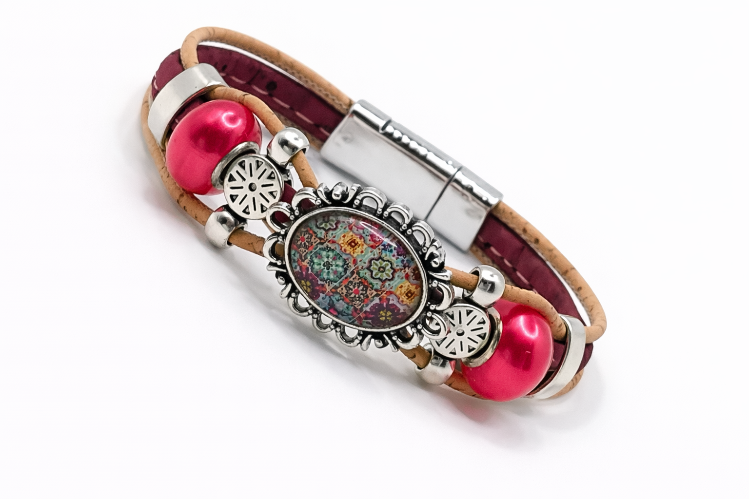 O design combina cortiça natural e vermelha, criando contraste e sofisticação, enquanto o cabochão colorido adiciona um toque vibrante e artístico, transformando a pulseira em uma peça única e marcante. Ideal para quem aprecia acessórios com estilo e personalidade.
