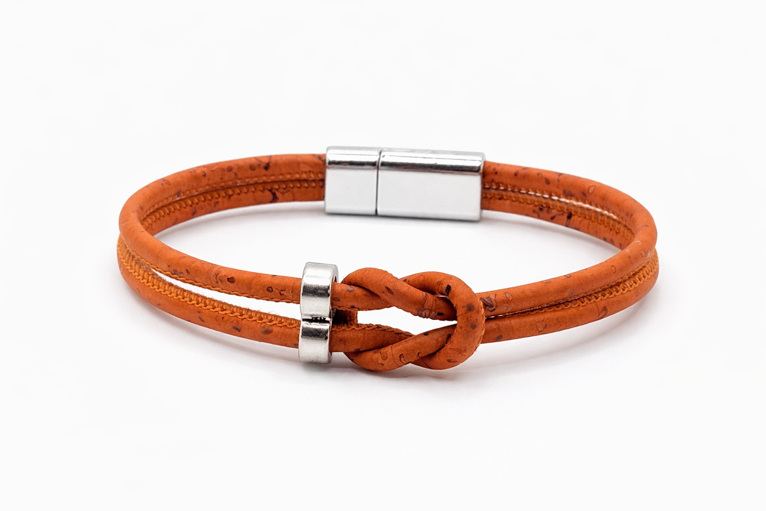 Moderna, leve e cheia de personalidade, esta pulseira de cortiça laranja é o toque perfeito para complementar qualquer look casual ou sofisticado.